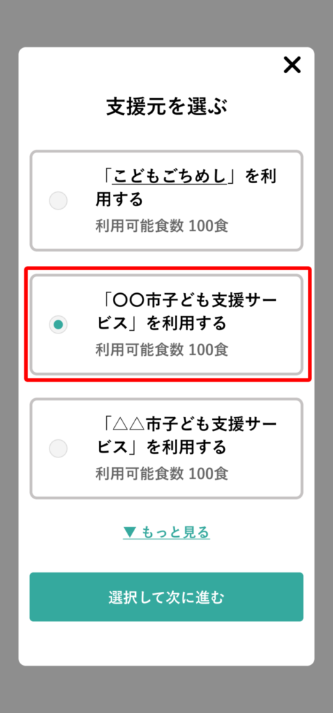 支援元を選ぶ画面が表示された場合は、任意の支援元を選択し、「選択して次へ進む」ボタンを押してください。