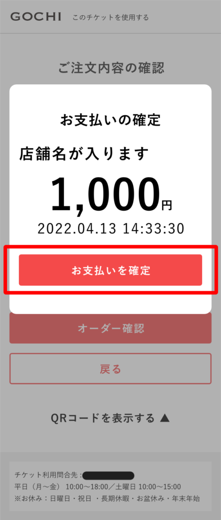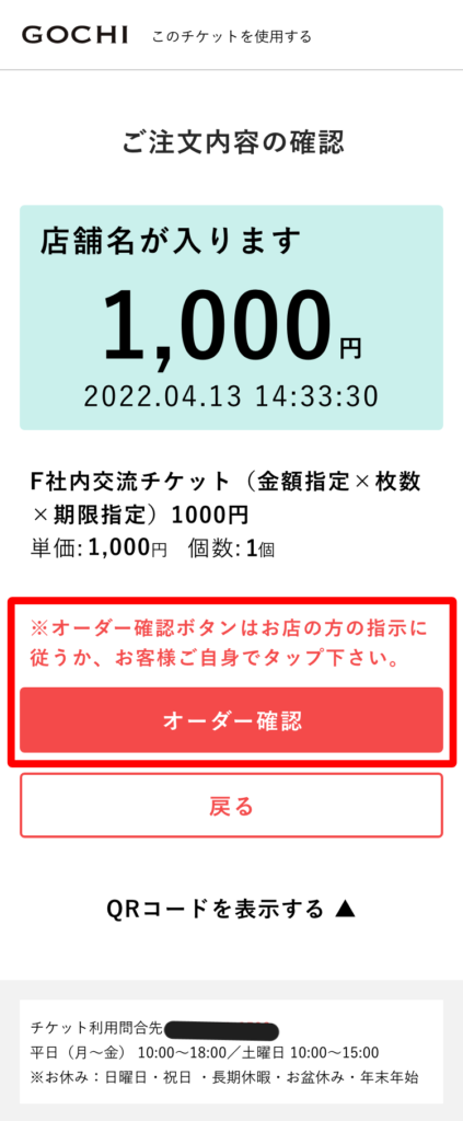 ご注文内容の確認画面が表示されますので店舗スタッフに内容を確認してもらい間違いなければ