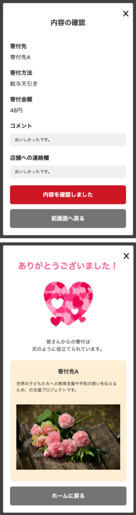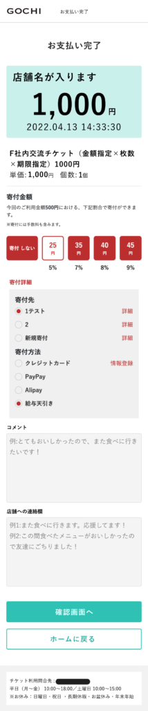 完了画面では寄付・お店の詳細ページで掲載されるコメント・お店の方にメッセージを送ることができます。