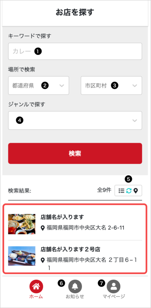 ❶ 探したいお店のキーワードを入力します。