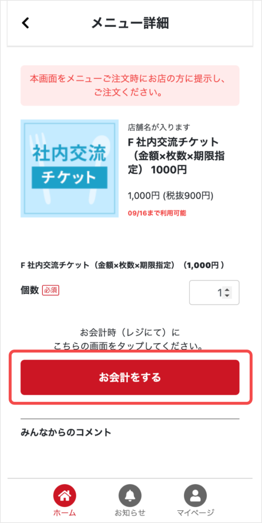 店舗詳細のメニュー内の「社内交流チケット」というチケットを選択します。